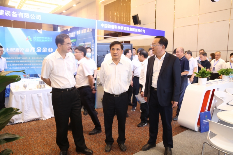 會議期間,黃民一行到集團(tuán)展廳及會議現(xiàn)場展區(qū)參觀交流,集團(tuán)推出的山東鐵路智能化建設(shè)管理平臺、CRTSⅢ型板式無砟軌道智能施工技術(shù)與裝備引得眾人關(guān)注。山東鐵路智能化建設(shè)管理平臺是以數(shù)字技術(shù)賦能高鐵智能化建設(shè)的重大成果,該平臺包含從設(shè)計到施工再到運營階段36個板塊、390多個功能模塊,實現(xiàn)了鐵路建設(shè)全生命周期管理,形成了“一張圖、數(shù)字化、智能化、可視化”的管理特色。平臺已在濟(jì)濱高鐵項目全面推廣應(yīng)用,取得了良好成效,累計產(chǎn)生數(shù)據(jù)量70余萬條,活躍用戶8000多人。CRTSⅢ型板式無砟軌道智能施工技術(shù)與裝備是指CRTSⅢ型板式無砟軌道“測量-調(diào)整-支護(hù)-灌注”一體化施工裝備,并與配套施工工裝之間無縫銜接,能夠提高施工效率50%以上,減少人力1/3以上,實現(xiàn)施工全過程質(zhì)量可控,并可拓展到其它類型無砟軌道施工中。