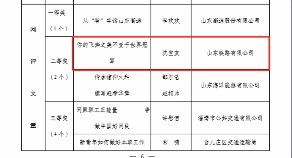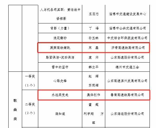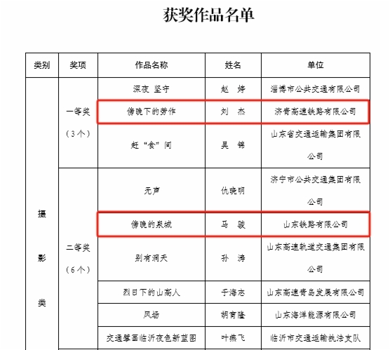在“網(wǎng)聚職工正能量 爭(zhēng)做中國(guó)好網(wǎng)民”新媒體原創(chuàng)作品評(píng)選中,濟(jì)青公司劉杰同志《傍晚下的勞作》榮獲攝影類一等獎(jiǎng);鐵路公司馬駿同志《傍晚的泉城》榮獲攝影類二等獎(jiǎng);濟(jì)青公司宋磊同志《萊榮高鐵鋪軌》榮獲攝影類三等獎(jiǎng);魯南公司集體創(chuàng)作《永遠(yuǎn)跟黨走》榮獲歌曲類二等獎(jiǎng);魯南公司董星辰同志《我是第一書(shū)記》榮獲微視頻類三等獎(jiǎng);基金公司集體創(chuàng)作《破圈》榮獲誦讀類二等獎(jiǎng);鐵路公司沈?qū)氂淹尽赌愕娘w奔之美不亞于世界冠軍》榮獲網(wǎng)評(píng)文章類二等獎(jiǎng)。