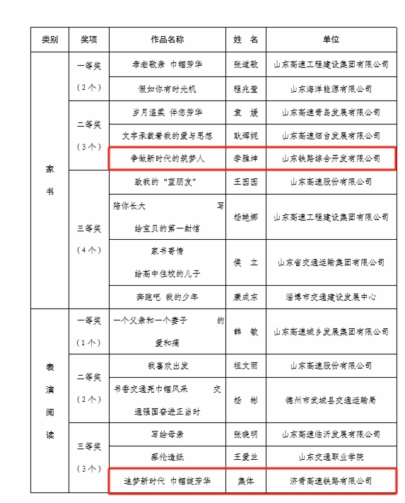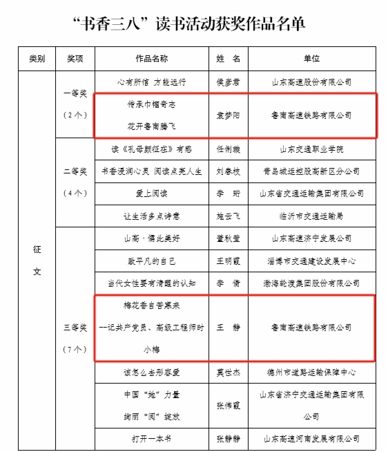 在“書(shū)香三八”讀書(shū)活動(dòng)評(píng)選中,魯南公司袁夢(mèng)陽(yáng)同志《傳承巾幗奇志花開(kāi)魯南騰飛》榮獲征文類一等獎(jiǎng);魯南公司王靜同志《梅花香自苦寒來(lái)--記共產(chǎn)黨員、高級(jí)工程師時(shí)小梅 》榮獲征文類三等獎(jiǎng);綜合開(kāi)發(fā)公司李雅坤同志《爭(zhēng)做新時(shí)代的筑夢(mèng)人》榮獲家書(shū)類二等獎(jiǎng);濟(jì)青公司集體創(chuàng)作《追夢(mèng)新時(shí)代 巾幗綻芳華》榮獲表演閱讀類三等獎(jiǎng)。
