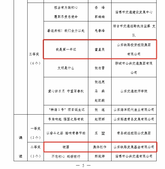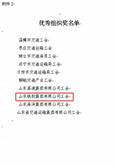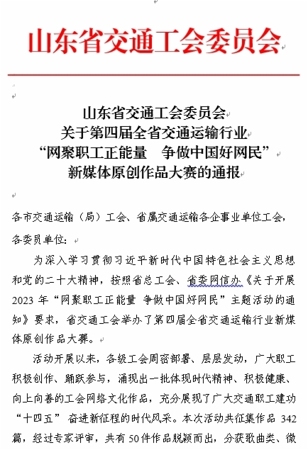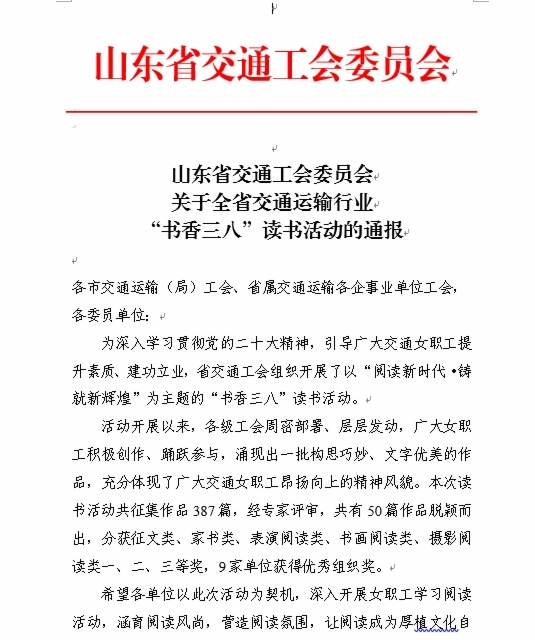 近日,由山東省交通工會(huì)舉辦的“網(wǎng)聚職工正能量 爭(zhēng)做中國(guó)好網(wǎng)民”新媒體原創(chuàng)作品大賽和“書(shū)香三八”讀書(shū)活動(dòng)評(píng)選結(jié)果揭曉。集團(tuán)工會(huì)選送的11個(gè)作品獲獎(jiǎng),集團(tuán)工會(huì)榮獲兩個(gè)活動(dòng)優(yōu)秀組織獎(jiǎng),受到省交通工會(huì)通報(bào)表?yè)P(yáng)。