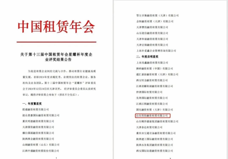 近日,在第十三屆中國租賃年會“星耀杯”年度企業(yè)評選中,山東鐵投集團所屬鐵投租賃公司斬獲“年度啟明星”獎,該獎項旨在突出企業(yè)實施戰(zhàn)略轉型期間,對行業(yè)具有影響力和貢獻力,能夠樹立良好榜樣的企業(yè)。這也是鐵投租賃公司2024年度繼獲得山東省融資租賃公司“高質量發(fā)展獎”榮譽稱號后,獲得的第二項年度榮譽。
