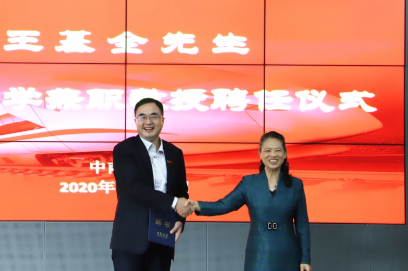 會議首先舉行了“王基全先生中南大學(xué)兼職教授聘任儀式”,田紅旗校長為王基全總經(jīng)理頒發(fā)了兼職教授聘書、佩戴了中南大學(xué)?;詹⒑嫌傲裟睢?/span>