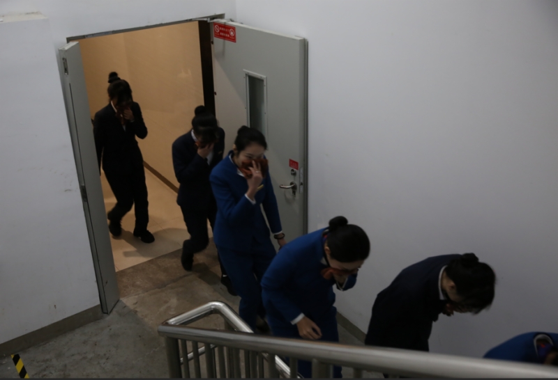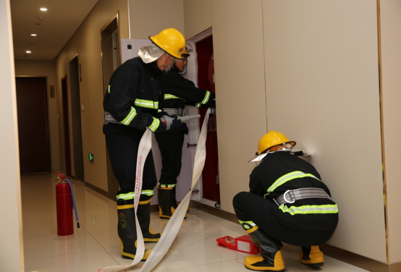 本次演練以2520會議室為模擬著火點,中控室收到煙感報警后,工作人員迅速確認火情,現場指揮立即啟動應急預案。滅火組快速穿戴消防服趕赴火場,利用滅火器、消防水帶撲救初期火災;設備組同步將全部電梯迫降至1樓,保障疏散安全;疏散組按照“向下疏散、應下盡下”原則,引導人員用濕毛巾捂住口鼻,沿指定樓梯有序撤離,身體不適人員按樓層就近疏散至避難層;警戒組、救護組分別做好現場警戒與應急救護準備。