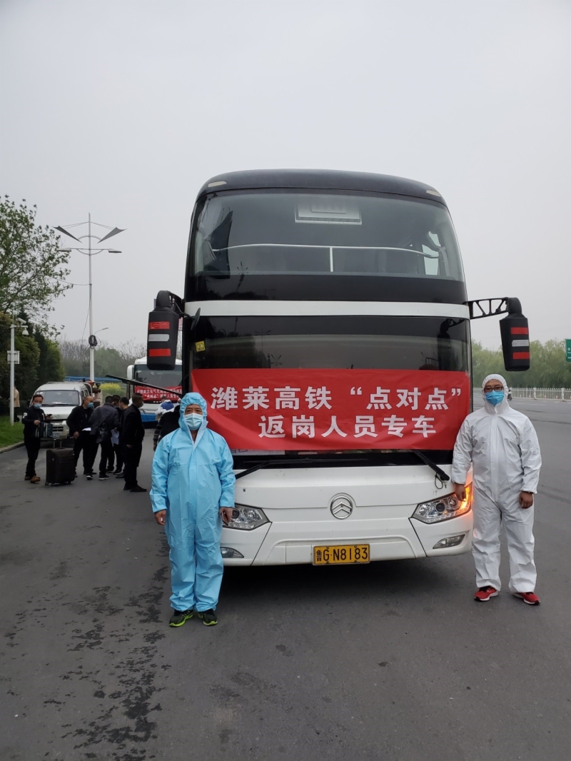 隨著疫情防控形勢(shì)不斷好轉(zhuǎn),濰萊高鐵復(fù)工復(fù)產(chǎn)速度加快。在濟(jì)青高鐵公司協(xié)調(diào)下,承擔(dān)濰萊高鐵四電工程的中鐵武漢電氣化局集團(tuán)濰萊高鐵項(xiàng)目部,主動(dòng)與濰坊市政府、應(yīng)急辦、防疫辦、交通局等相關(guān)職能部門溝通,開出了首趟復(fù)工復(fù)產(chǎn)“點(diǎn)對(duì)點(diǎn)一站式”直達(dá)大巴車,保障復(fù)工人員順利返崗,解決了企業(yè)用工荒,也為地方經(jīng)濟(jì)建設(shè)復(fù)蘇注入了“強(qiáng)心劑”,實(shí)現(xiàn)了員工、企業(yè)、政府的互利多贏。