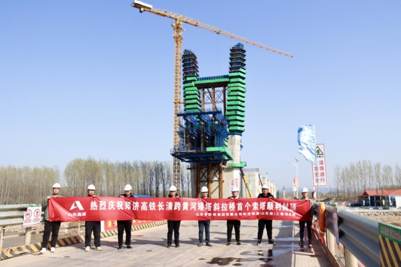 在前期施工過程中,鐵投集團(tuán)主要領(lǐng)導(dǎo)多次組織濟(jì)鄭公司及濟(jì)南局集團(tuán)鄭濟(jì)工程建設(shè)指揮部指導(dǎo)山東路橋項目部結(jié)合跨黃河矮塔斜拉橋建設(shè)特點(diǎn),超前謀劃、科學(xué)組織、合理調(diào)配資源、分解目標(biāo)計劃、細(xì)化工期安排,克服了異形橋塔索鞍定位、大體積混凝土、冬期極寒天氣、黃河大流量下泄排洪等不利因素,順利完成首個主墩索塔封頂。首個主墩索塔的順利封頂,標(biāo)志著大橋即將進(jìn)入斜拉索掛索施工,為后期的全橋合龍以及2023年底全線開通奠定了良好的基礎(chǔ)。