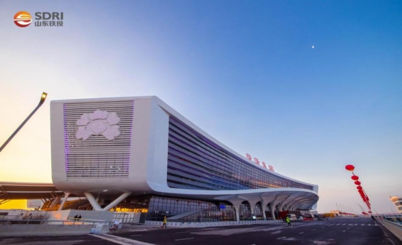 菏澤東站總建筑面積198697㎡,站場共6臺15線,為高架跨線式,采用“橋建合一”結(jié)構(gòu)形式。該站以“牡丹之都、生命之澤”為主題,以“四澤十水流、盛世牡丹開、迎八方來客”為設(shè)計立意,采用傘狀鋼結(jié)構(gòu)落客雨棚、一體化屋面掀起高窗、工字收腰內(nèi)凹立面,體現(xiàn)當?shù)氐赜蛭幕厣?。菏澤東站站房頂部帶型天窗采用層層掀起的造型,通過流線造型展現(xiàn)“水”的歷史文脈。站房站區(qū)生產(chǎn)生活房屋按照“一站一景、站城融合”的理念傾心打造,與站房建筑外觀和諧統(tǒng)一,與周邊環(huán)境交相輝映。