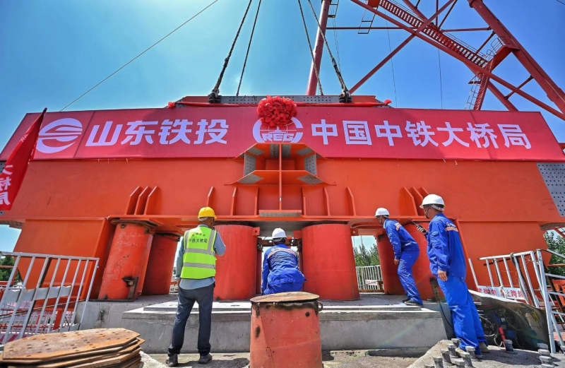 7月7日11時10分,隨著現(xiàn)場總指揮一聲令下,重達75噸的第一根鋼桁梁下弦桿穩(wěn)穩(wěn)降落,精準安裝在濟陽黃河公鐵兩用特大橋主橋P40號墩頂,濟濱高鐵全線首節(jié)鋼梁成功架設,標志著濟陽黃河公鐵兩用特大橋建設邁入全新階段。